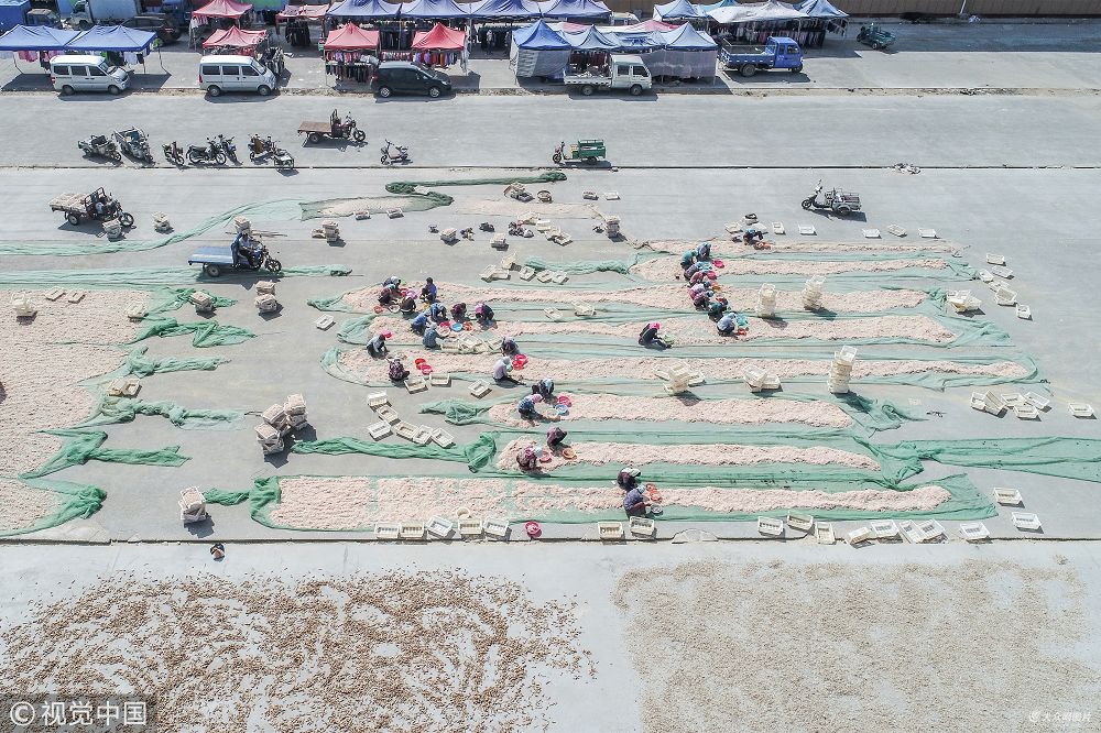2018年9月5日,山東濱州,隨著黃渤海重新開(kāi)放捕魚(yú),海產(chǎn)品市場(chǎng)又重新煥發(fā)生機(jī)。在魯北地區(qū)最大的海產(chǎn)品干貨批發(fā)市場(chǎng)所在地馮家鎮(zhèn),當(dāng)?shù)卮迕裾跒榉謷鞣N海貨忙碌著。從事這個(gè)行業(yè)的大都為中老年留守婦女,在本村工作,她們足不出戶也能掙到大約60元左右的半日薪。