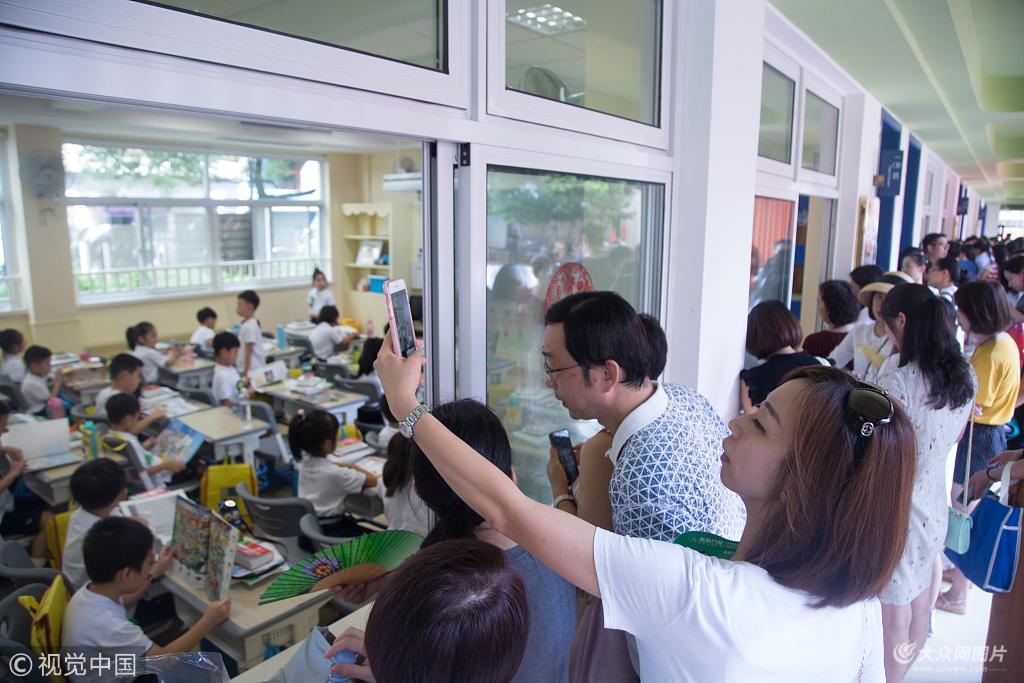 2018年9月2日,杭州長江實驗小學開學,一年級生迎來小學第一堂課。教室內小朋友認真聽課,教室外窗口門框邊倚靠著很多圍觀家長。爺爺奶奶爸爸媽媽齊刷刷地簇擁在教室外觀望,時而拿出手機記錄孩子們的人生第一課。