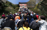 國慶32萬余人爬泰山 軍大衣登山棍成標配
