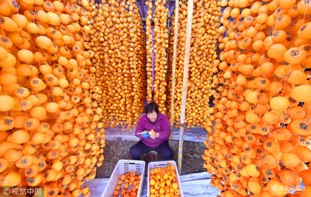 2018年10月23日,山東省淄博市沂源縣悅莊鎮陳家官莊村的農民在將加工的柿子進行吊曬。