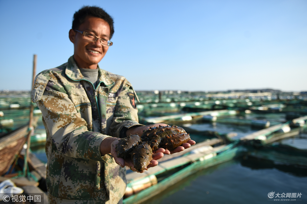 2018年11月1日,山東省榮成市石島管理區石島灣海域深海養殖區,海參養殖戶在捕撈海參,并給網箱養殖的海參換網。