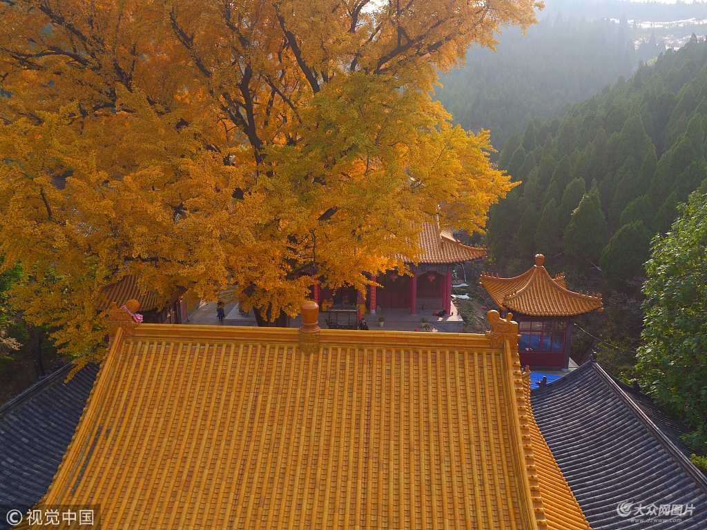 2018年11月2日,濟南,深秋的淌豆寺內千年銀杏樹葉金黃,宛如披掛黃金甲,空中俯瞰與周邊綠色樹木相互輝映,猶如金鑲玉深藏山中,獨成一景。