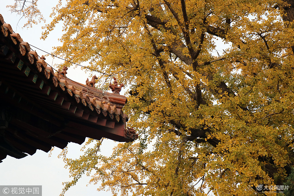 2018年11月4日,山東泰安。泰山岱廟景區內的數棵千年銀杏樹開始陸陸續泛著金黃色。