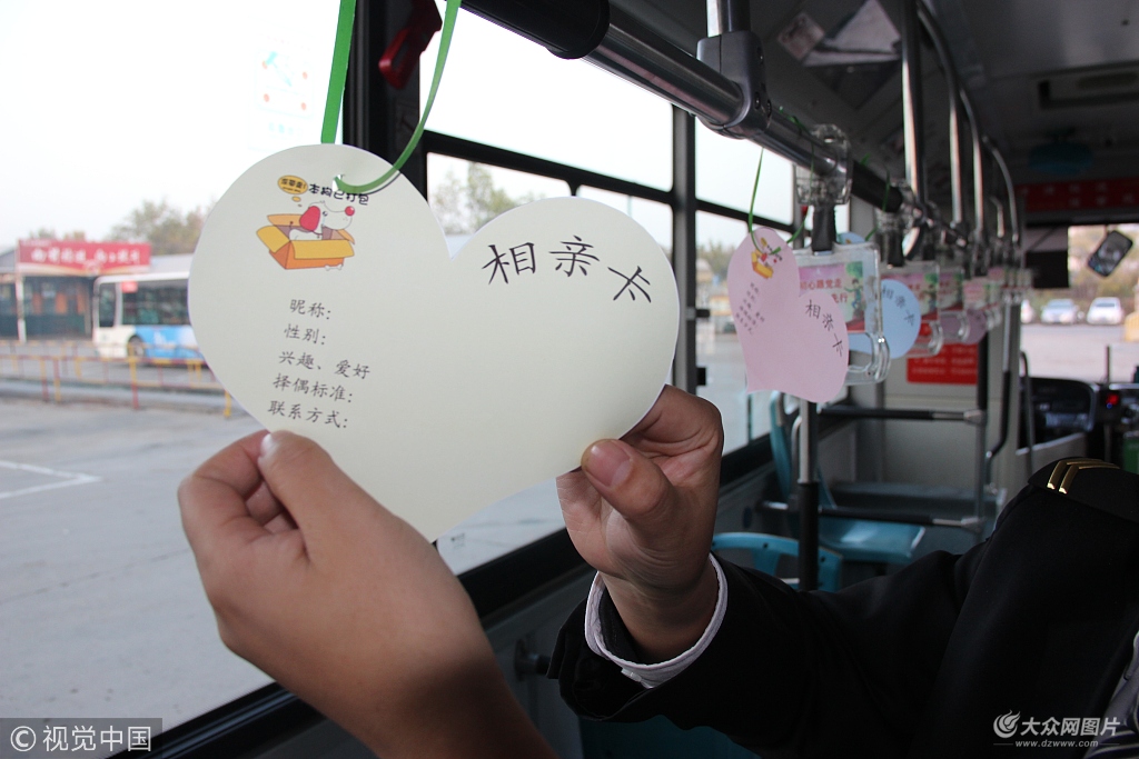 此外,為了讓平時忙于工作的年輕人早日脫單,這輛“脫單專車”還在醒目位置掛滿了“相親卡”,搭建起相親平臺,邀請單身的乘客將自己的興趣、愛好、聯系方式以及擇偶標準等基本信息,填寫在相親卡上,其他乘客上車后,也可以從相親卡中尋覓自己感興趣的另一半。乘客劉女士看完相親卡的信息后,拿起手機拍照發給了自己的朋友,“我的閨蜜今年27歲,性格很內向,我給她挑了個合適的,希望她能完美脫單。”