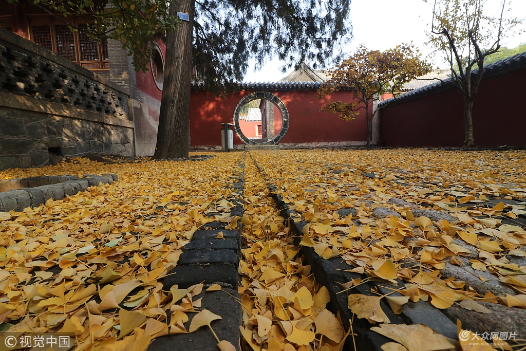 2018年11月13日,山東泰安,冬風吹拂,泰山普照寺千年銀杏樹下,古磚上鋪了一層層、一疊疊黃金的銀杏葉子,像鋪成了黃金地毯,場面十分壯觀。