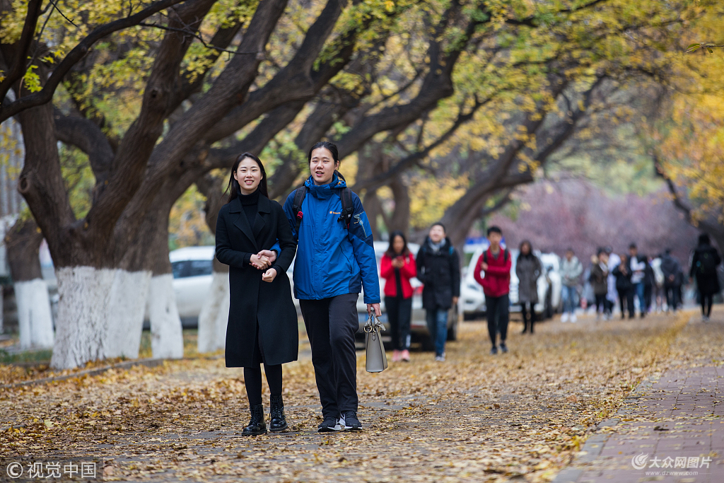 2018年11月17日,濟南秋意濃濃,山東師范大學校園內落葉飛舞,在校園內的一條主干道上,金黃的樹葉鋪滿一地,美麗無比,學生上課仿佛穿越畫中,可以盡情欣賞這唯美的秋色。