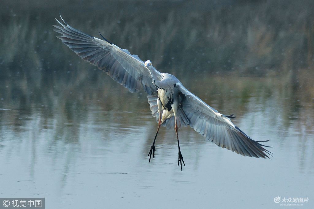 2018年12月10日,翩躚起舞的蒼鷺在青島城陽區墨水河上覓食。