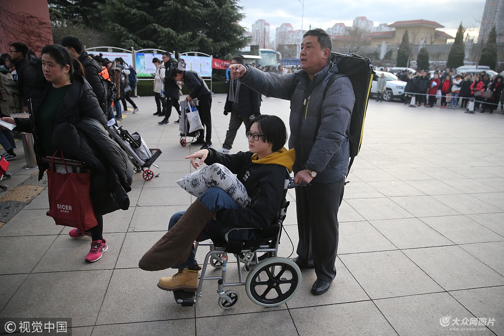 2018年12月15日,2019年山東省美術(shù)統(tǒng)考青島考場(chǎng)正式開始,來自各校的藝考生已經(jīng)在這里集合,準(zhǔn)備等候進(jìn)入考場(chǎng),不少家長(zhǎng)在一旁陪同,幫孩子拿著畫具。其中一名叫雅琦的考生因腿部受傷,坐在輪椅上,被父親推著來到考場(chǎng)。今年考場(chǎng)對(duì)進(jìn)場(chǎng)考生首次進(jìn)行了人臉識(shí)別系統(tǒng),防止替考現(xiàn)象發(fā)生。據(jù)了解,考試8點(diǎn)30分開始,上午考速寫、造型基礎(chǔ),下午考色彩基礎(chǔ),其中速寫考試是統(tǒng)考中首次增加的考試項(xiàng)目。