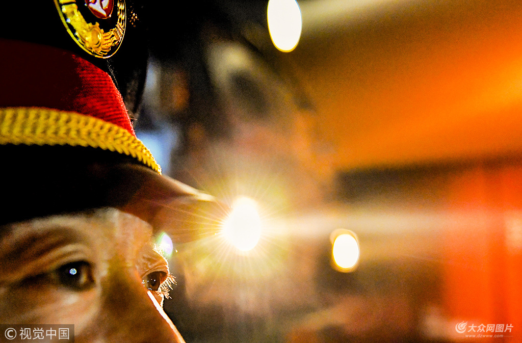 2018年12月13日,山東棗莊,山東能源棗礦集團鐵運處車務段尹洼站助理值班員王偉目送列車駛出站臺。