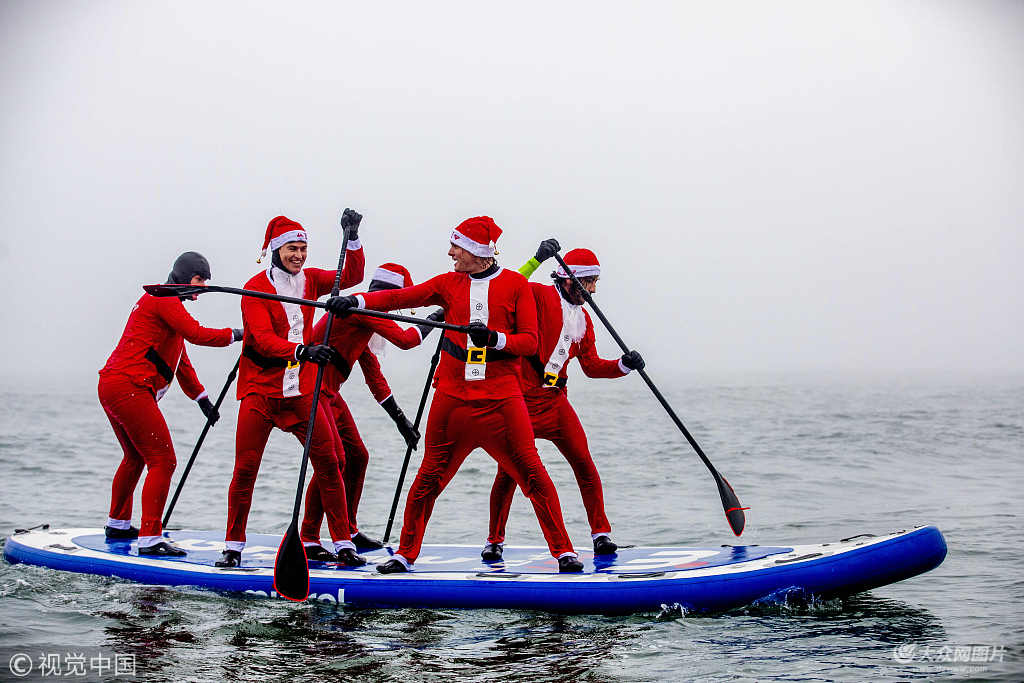 當地時間2018年12月16日,荷蘭海牙,150多名沖浪好手聚集在斯赫弗寧恩海灘,參加“圣誕老人”沖浪活動。