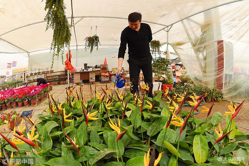 山東濰坊,青州市黃樓街道花農在為花卉澆水