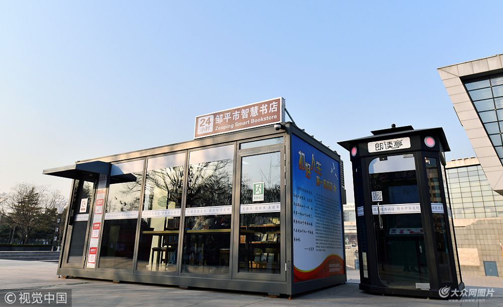 2018年12月24日,位于山東省濱州市鄒平市新時代文明實踐廣場上的24小時智慧書店和朗讀亭調試完畢,正式對讀者開放。讀者們紛紛前來,感受黑科技+閱讀的魅力。
