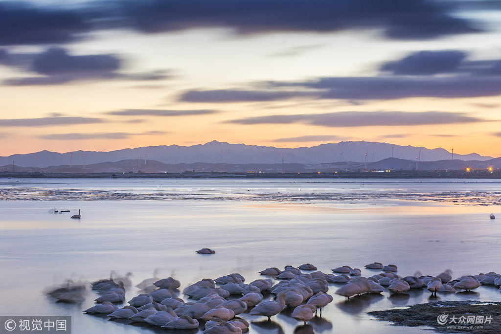 威海雪后暮色如畫 天鵝棲息吸引攝影愛好者采風