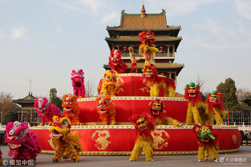 2018年12月30日,在山東棗莊臺(tái)兒莊古城,民間藝人在向游客表演鼓塔舞獅。