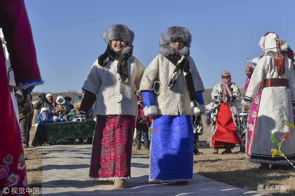 2018年12月29日,內蒙古錫林郭勒盟。當日,在正藍旗的草原上,牧民們輪流展示著自制的富有民族特色的冬裝。