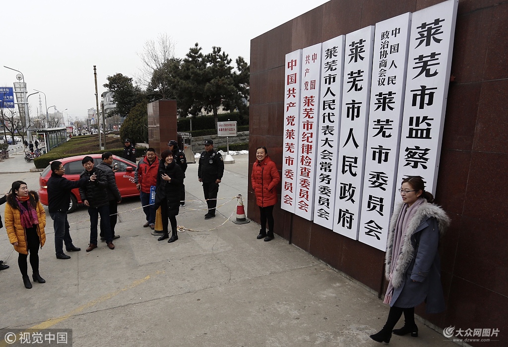 2019年1月9日,山東萊蕪,不少市民來到文化北路001號市委市政府門前合影留念。