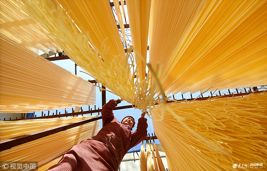 2019年1月22日,山東淄博,春節臨近沂源縣的手工掛面加工戶開始忙碌起來,那一掛掛五顏六色的掛面又開始掛滿農家院,為鄉村增添了濃濃的年味。