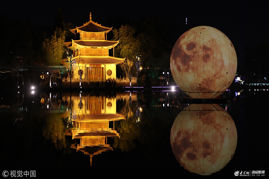 2019年1月25日,云南省昆明市,一個直徑8米、高12米的巨型“月亮”亮相昆明大觀公園新春燈展,形成“月映名樓”的獨特景觀。