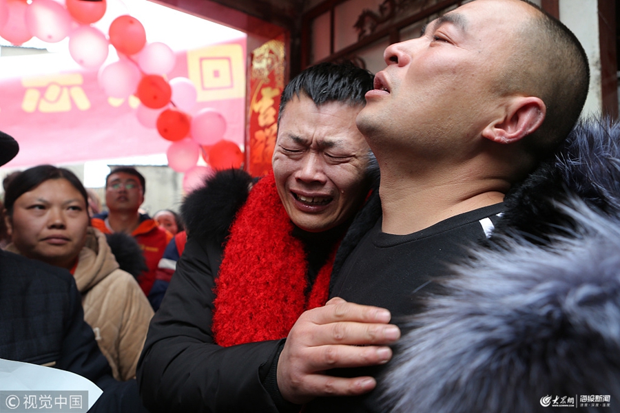 2019年1月23日,劉兵抱著表哥晉趙健痛哭。廣漢市三水鎮(zhèn),被拐34年的劉兵回到家中,重新見到父母,他的母親李天華已經(jīng)失明。紅星新聞記者 劉海韻/視覺中國