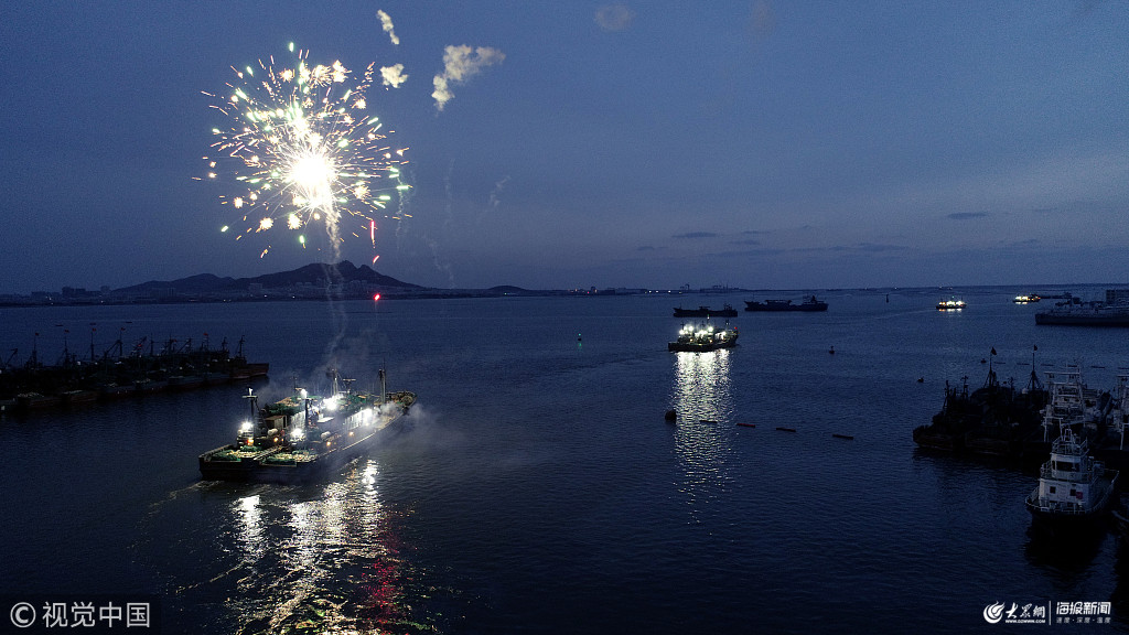 2019年2月10日清晨6點,正月初六,山東省榮成市石島管理區赤山集團10余條大馬力漁船,在新春的爆竹聲和親人祝福聲辭別家人,從斥山碼頭相繼拔錨啟航。圖片作者:楊志禮/視覺中國