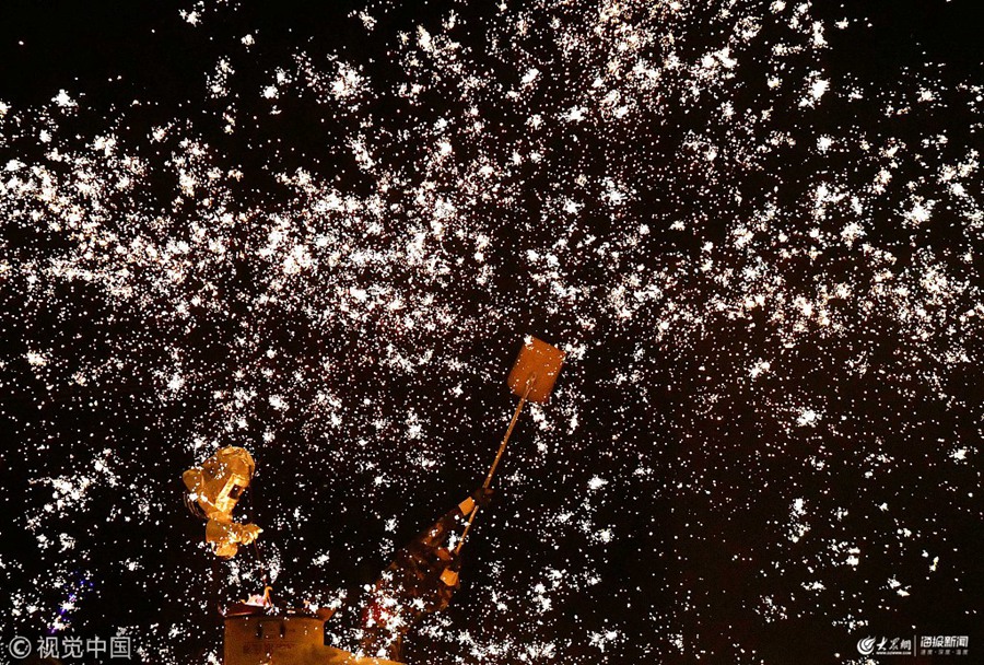 2019年2月17日,元宵節(jié)將至,山東煙臺(tái)各大公園景區(qū)張燈結(jié)彩,民俗展演精彩紛呈,人們?cè)跉g樂喜慶的節(jié)日氛圍里迎接元宵佳節(jié)的到來。2019年2月17日,在山東省煙臺(tái)市塔山旅游風(fēng)景區(qū),民間藝人在打鐵花。