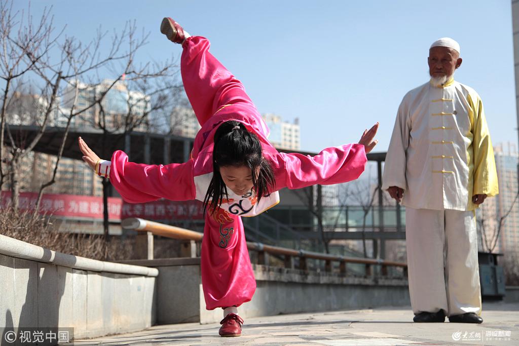 2019年3月2日,青海省西寧市,馬麗椰和年近84歲的爺爺照常在廣場上練習八門拳。“00后”女孩馬麗椰5歲起就跟著她爺爺馬祥祿學習青海傳統武術套路八門拳,十余年來參加了數百場國內外武術比賽,至今已經贏得80多塊金牌,50多塊銀牌。爺爺馬祥祿練習八門拳近70年,在馬麗椰看來,她和爺爺有著共同的夢想,就是要將八門拳傳承下去,打出青海八門拳的精氣神。圖為爺爺馬祥祿指導馬麗椰練武。