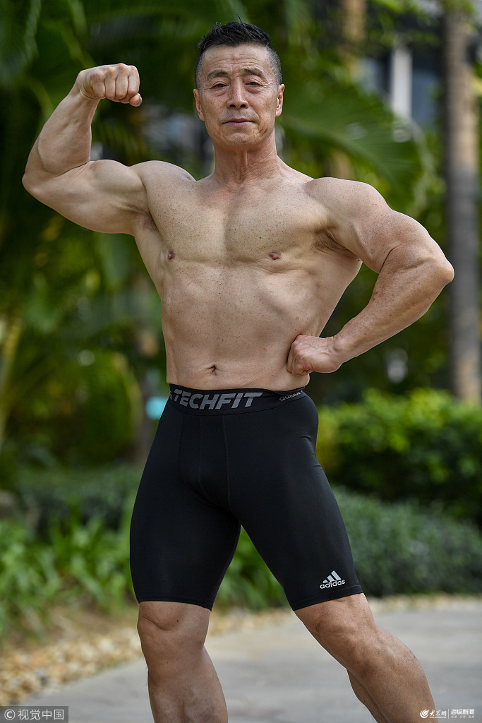 2019年3月12日,三亞。楊新民展示肌肉。楊新民,1949年生人,“一開始我是喜歡健美,后來我發現健美不光是一種體育運動,而且是一種生活方式。健美是一種人體的雕塑,你就是雕塑家,在雕塑你自己的形體,也雕塑你的人生。”