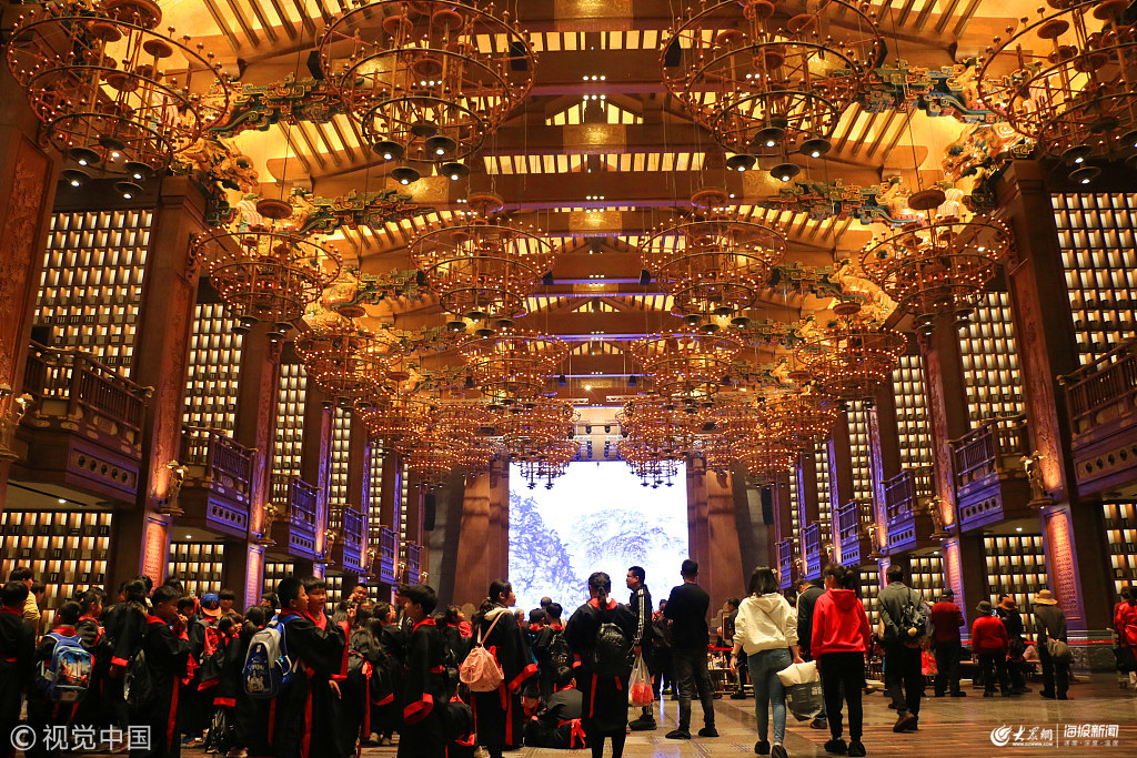 2019年4月7日,山東濟寧,游客在清明假期游覽孔子大學堂。孔子大學堂總建筑面積為6.5萬平方米,建筑高度49米,是儒學的大學堂,傳授的是孔子的核心思想“仁智禮義信”,設計中將“仁智禮義信”五個廳堂設計成為建筑的中心和空間。