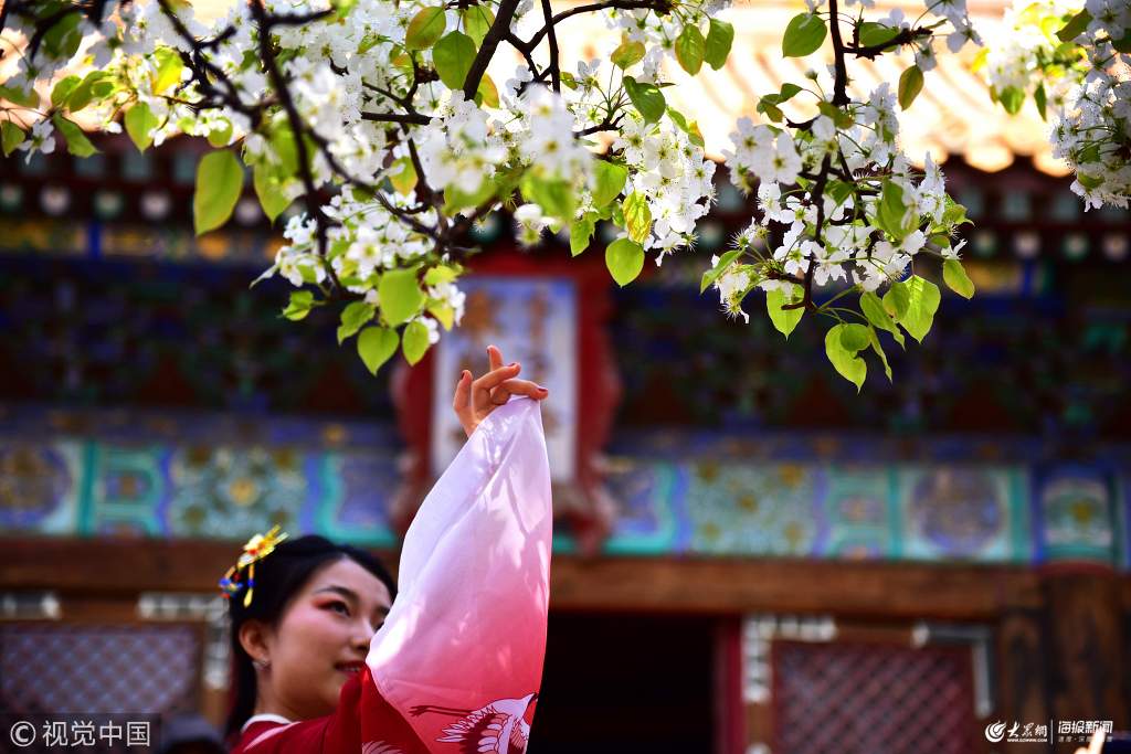 2019年4月7日,游客在故宮欣賞春花。進入四月,北方天氣回暖,故宮博物院百花盛開,花香四溢,吸引了大批中外游客前來觀賞。