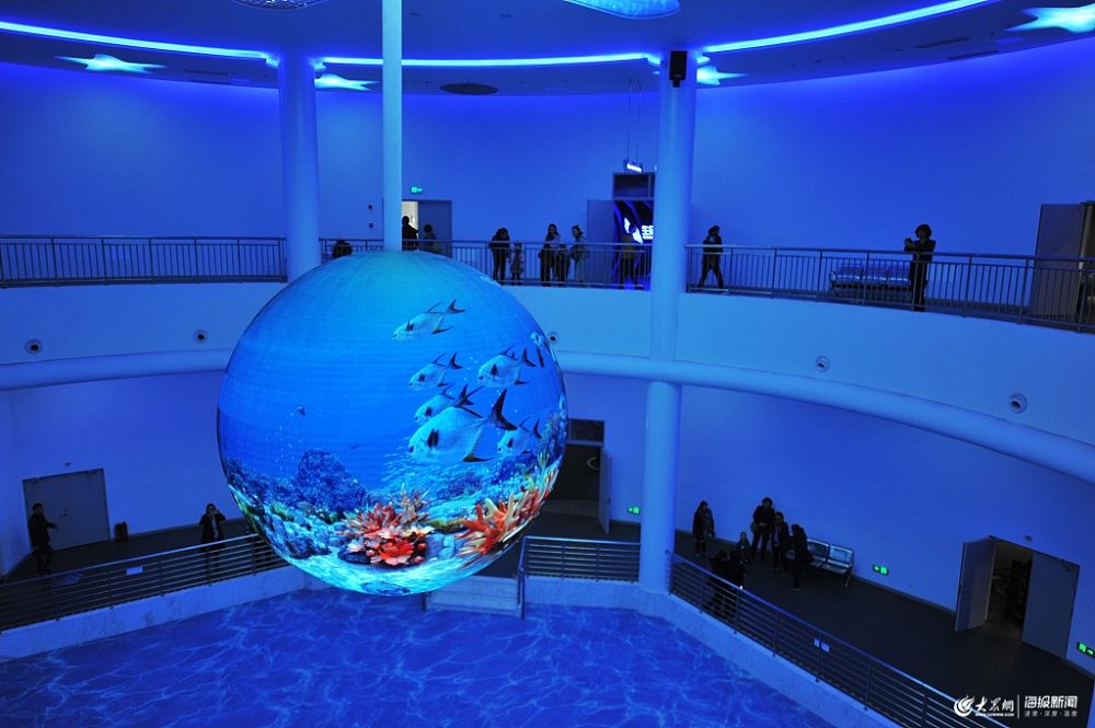 日照海洋科普館經(jīng)試運(yùn)行一年后于4月26日正式向游人開放。據(jù)了解,該館占地3萬平方米,共設(shè)128個(gè)展品展項(xiàng),通過AR、4D、生物標(biāo)本、模型、互動(dòng)體驗(yàn)及海洋科普教育等方式,讓人們進(jìn)一步認(rèn)識(shí)大海,了解海洋知識(shí)。2019年4月28日,游客在日照海洋科普館海底世界立體球展廳參觀。