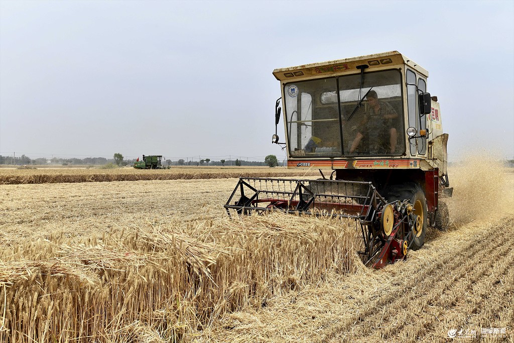 2019年6月5日,山東棗莊。魯南小麥大面積開始進入收獲期,當地農民搶抓農時開展夏收作業(yè),金黃的麥田里一派繁忙景象。
