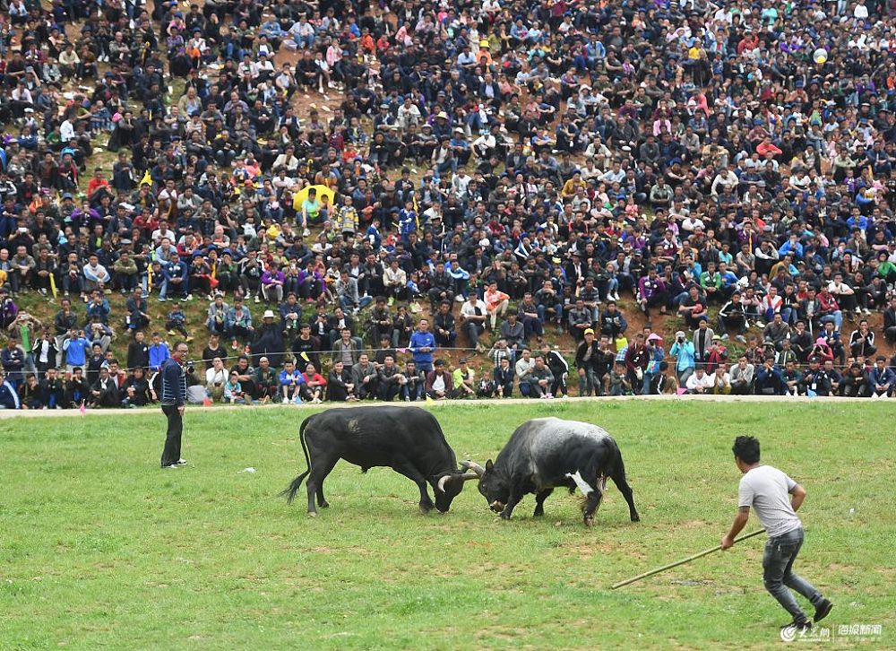 2019年7月22日,四川涼山,在2019中國布拖彝族火把節分會場布拖縣拖覺鎮原生態廣場上開展了傳統民俗競技斗牛、斗羊、斗雞、賽馬等系列活動,吸引了國內外游客和攝影愛好者前來觀看。