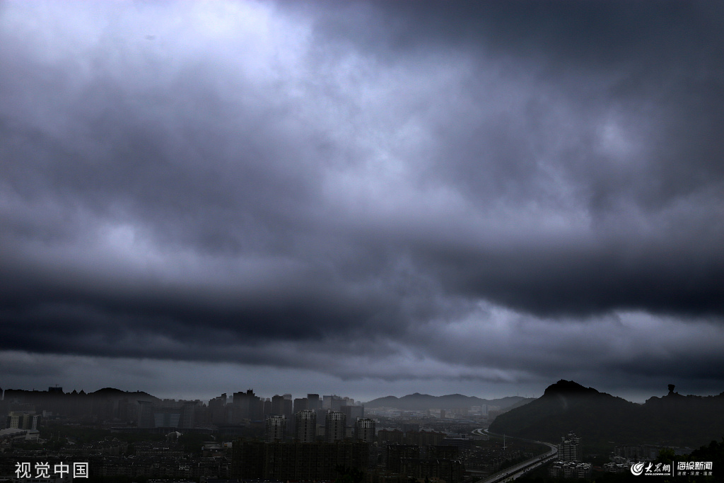 2019年8月9日上午,浙江臺州,受今年第9號超強臺風“利奇馬”逼近的影響,溫嶺市城區黑云壓城,時不時刮起強風下著暴雨,溫嶺石塘鎮和城南鎮沿海潮水掀起巨浪拍打著堤壩和礁石,為了保證安全,溫嶺城南鎮、濱海鎮、松門鎮、石塘鎮千艘漁船早已全部駛入避風港?慷惚堋袄骜R”。