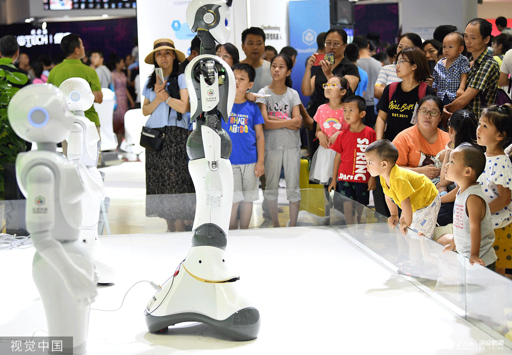 2019年8月24日,北京,2019世界機器人大會迎來周末客流高峰,觀眾當中有很多家長帶著孩子前來,與各種機器人近距離接觸、互動、學習,讓孩子從小在心里種下高科技、機器人的種子。