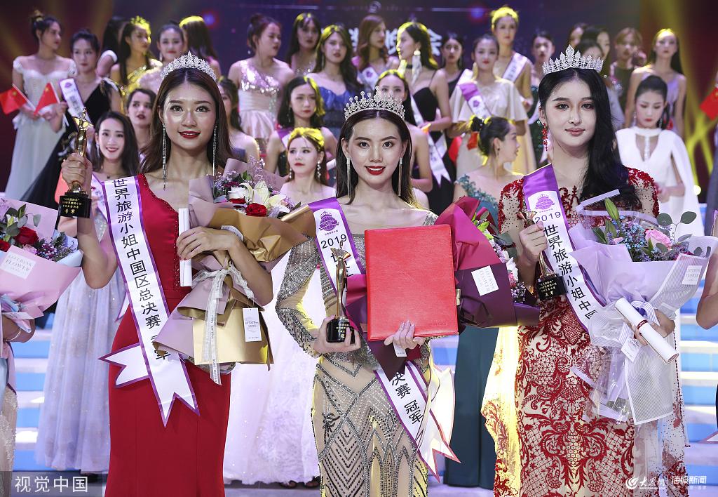 2019年8月28日晚,2019世界旅游小姐中國年度冠軍總決賽在內蒙古自治區巴彥淖爾市落下帷幕。來自全國25個省市賽區的43名選手經過激烈角逐,譚若依(中)最終奪得冠軍,選手陳蕾娜(右)獲得亞軍,米捷睿(左)獲得季軍。 趙雋(攝影部)/中新社/視覺中國
