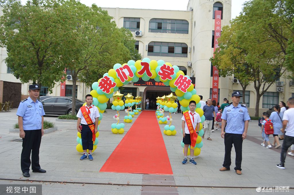 2019年9月1日,江蘇鹽城,開學第一天,多名民警、輔警指揮車輛快速通過,確保學校門前的秩序井然。