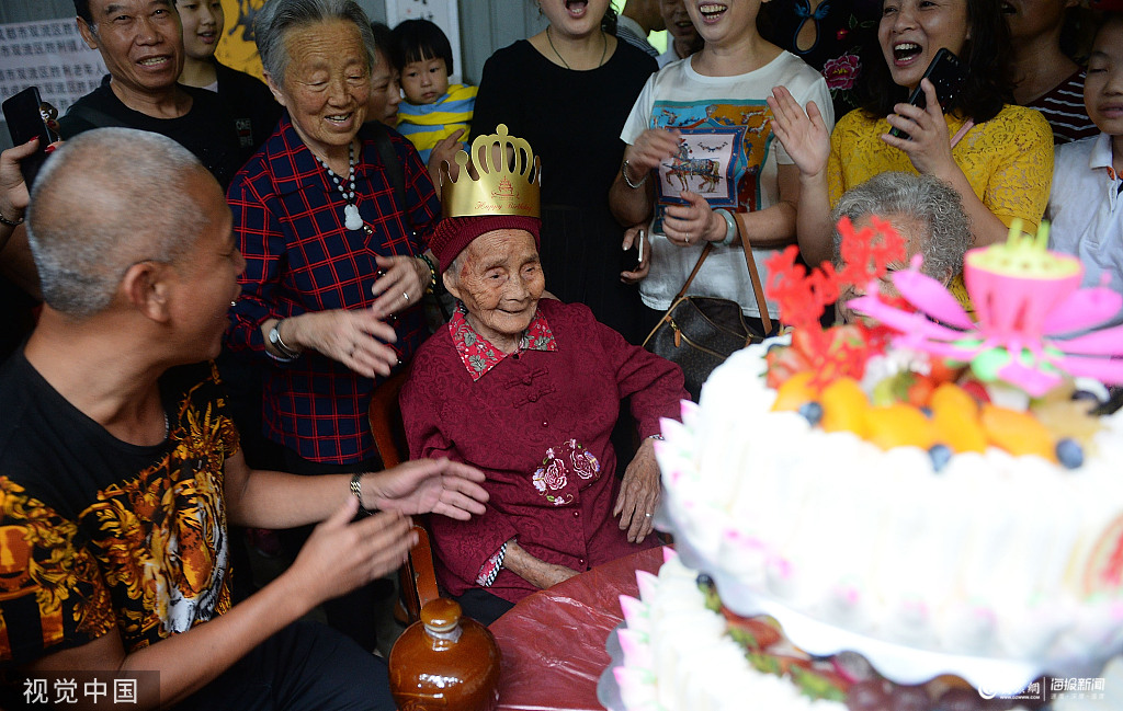 2019年8月31日,四川省成都市,朱鄭氏老人坐在蛋糕前。