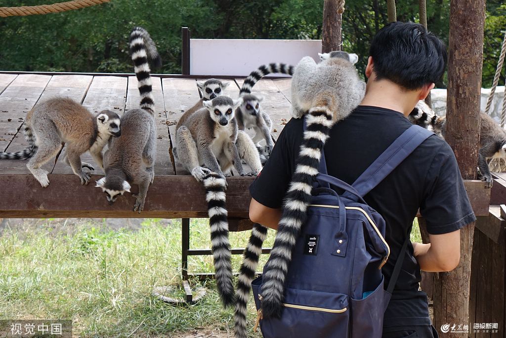 2019年9月6日,山東青島森林野生動物世界,環尾狐猴與游客零距離接觸,場面溫馨,諧趣橫生,令人忍俊不禁。