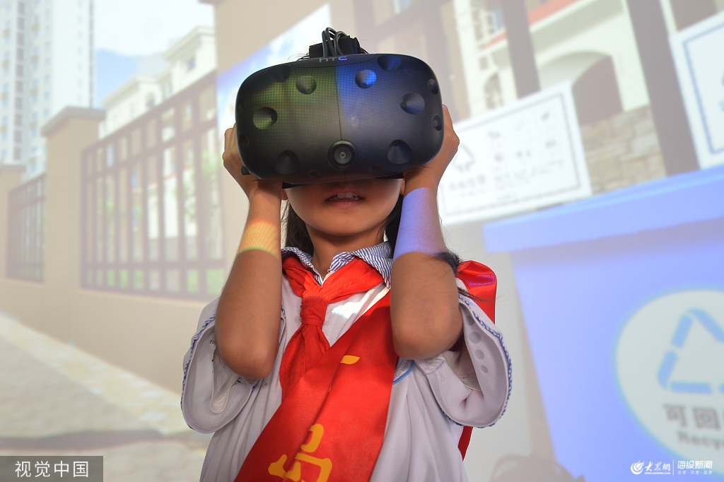 2019年9月24日,青島長陽路小學的學生通過VR沉浸式互動體驗,學習垃圾分類知識。
