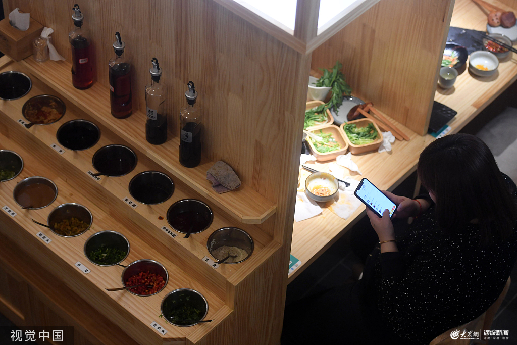 2019年2月28日,武漢,漢口香港路附近新開張的一家火鍋店,就餐的客人可以坐在屬于自己的小隔間里美滋滋吃一頓。如果想有一段美麗的“邂逅”,可以打開桌子上的特殊開關(guān),對方若也恰好有此意,原本相隔的桌子會相通,可以一邊燙火鍋一邊和陌生的有緣人聊天。