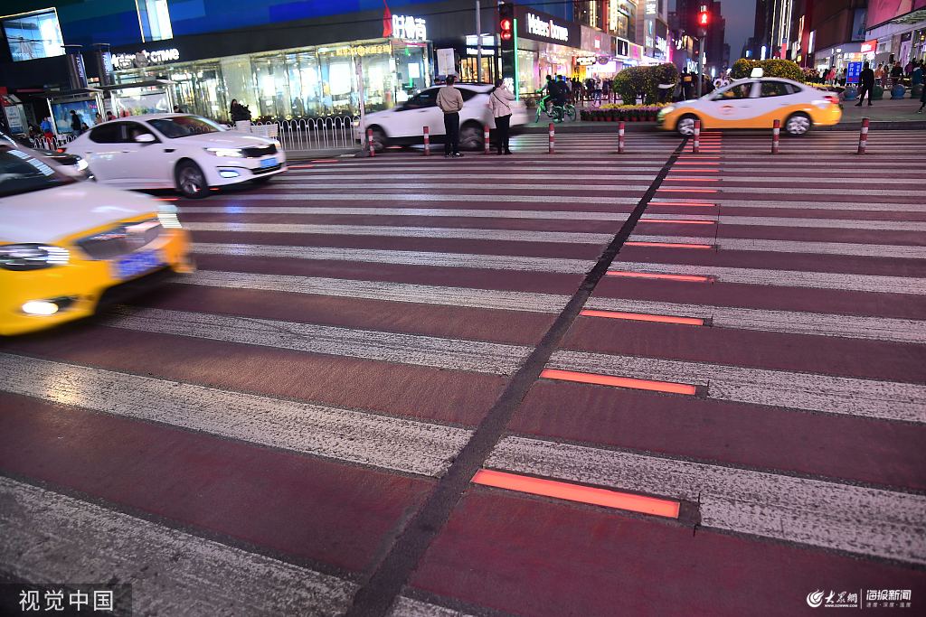 2019年10月10日,沈陽(yáng),位于中華路與太原街交會(huì)處的斑馬線,隨著交通信號(hào)燈的變換,閃爍起紅、黃、綠的顏色,在夜幕下格外醒目。