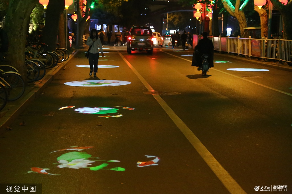 濟南火車站出口附近非機動車道上開起3D濟南地域特色“荷花”,讓夜間的非機動車道充滿特色。