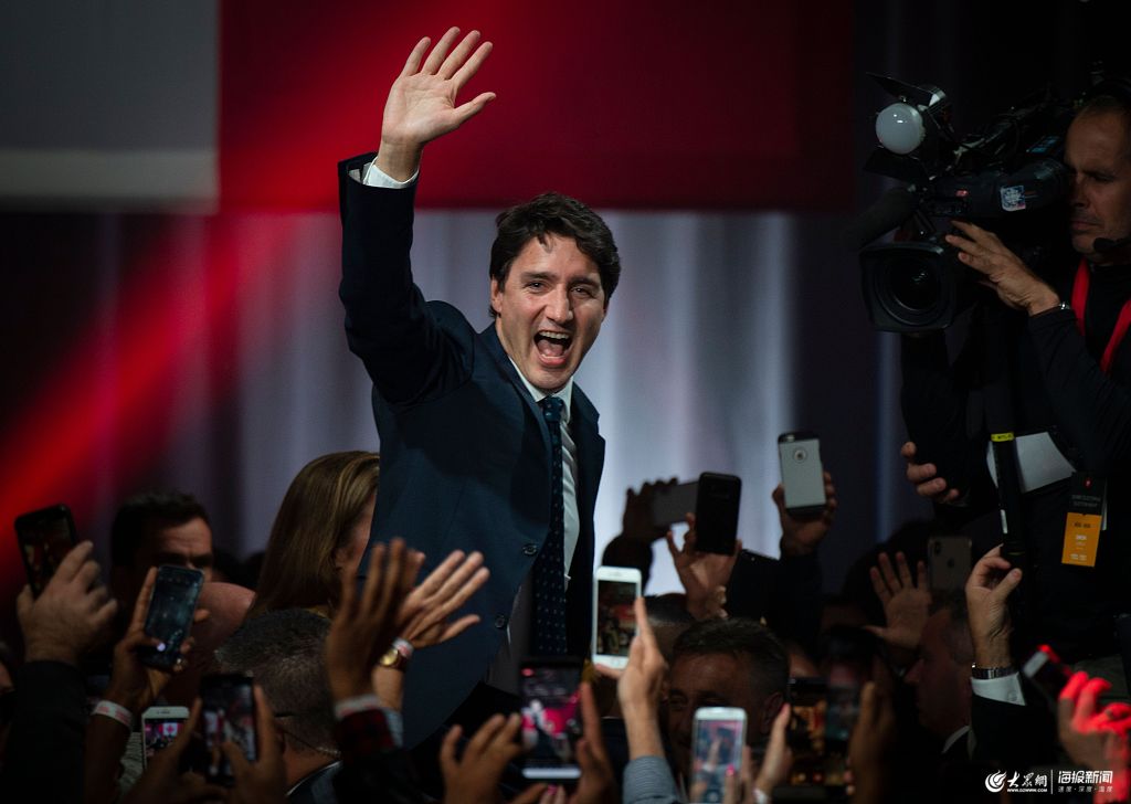 當(dāng)?shù)貢r(shí)間2019年10月22日,加拿大蒙特利爾,加拿大新一屆議會(huì)選舉結(jié)束后,加拿大總理特魯多慶祝勝選。