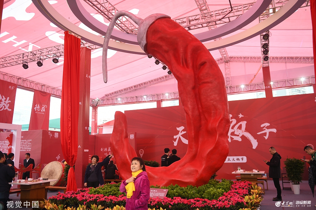 2019年10月25日,重慶,第十一屆中國(guó)(重慶)火鍋美食文化節(jié)在北濱路金源時(shí)代購(gòu)物廣場(chǎng)盛大開(kāi)幕,巨型辣椒雕塑“天之椒子”驚艷亮相。該辣椒雕塑高6米、重3.14噸,象征著紅火與熱情,由意大利藝術(shù)家朱紙創(chuàng)作,吸引眾人目光。圖片作者:渝慶/視覺(jué)中國(guó)