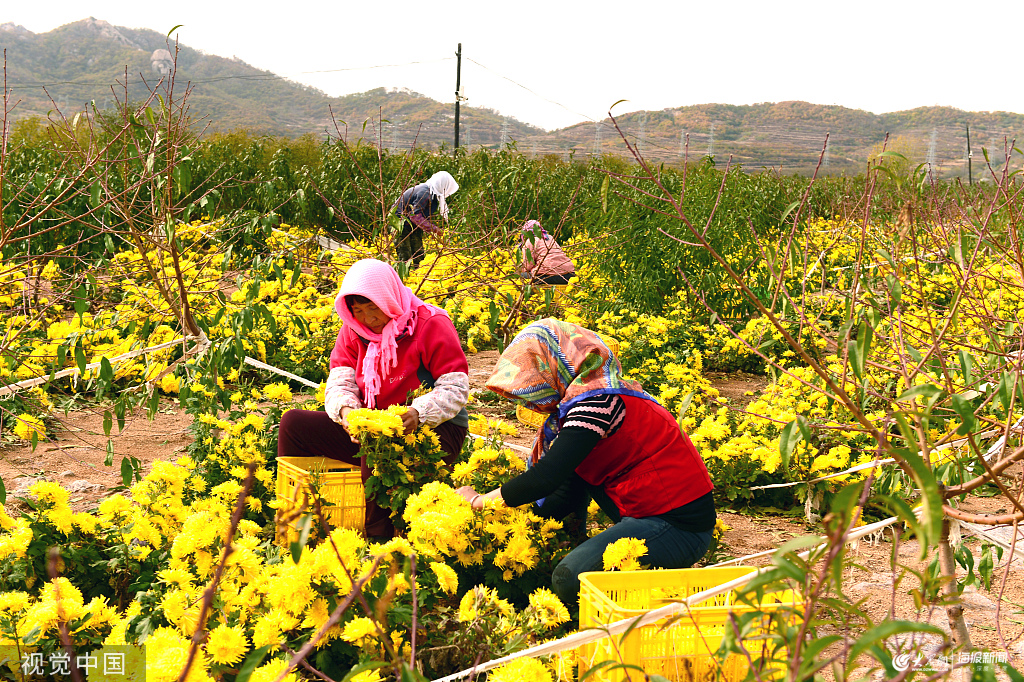 2019年11月12日,山東威海榮成市石島管理區寧津街道留村一家中藥材種植專業合作社基地,間隔種在文冠果樹苗里的金黃色菊花盛開,村民們正穿梭在盛開的菊花叢中,忙著采摘菊花。