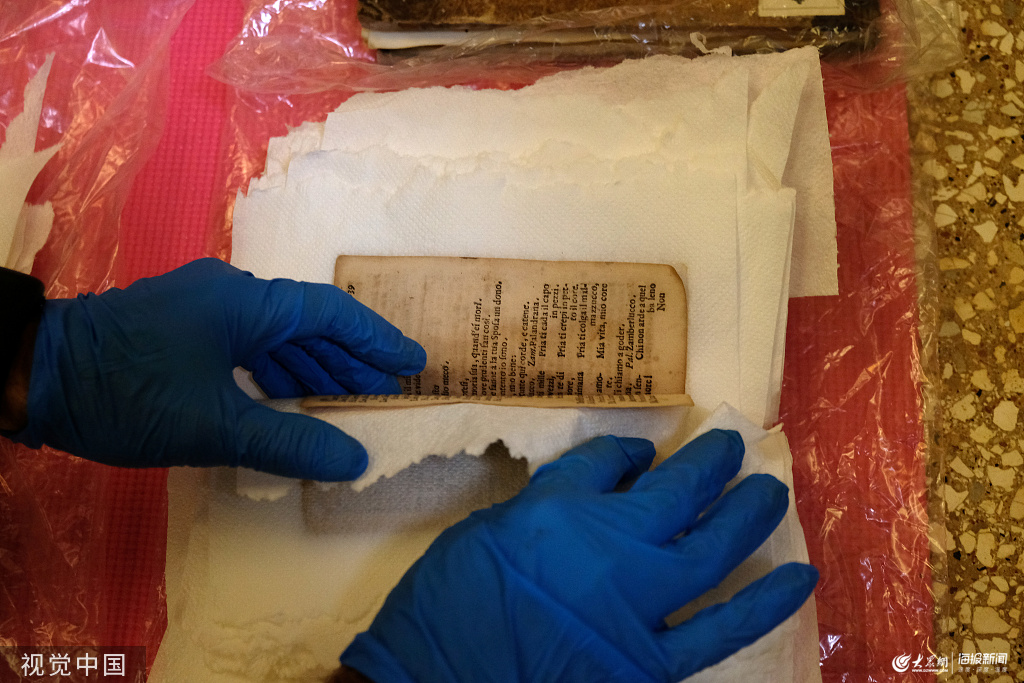 當地時間2019年11月16日,意大利威尼斯,當地遭遇嚴重洪災,志愿者搶救貝內代托·馬爾切洛音樂學院( music conservatory Benedetto Marcello)中歌劇家貝內代托·馬爾切洛的手稿。