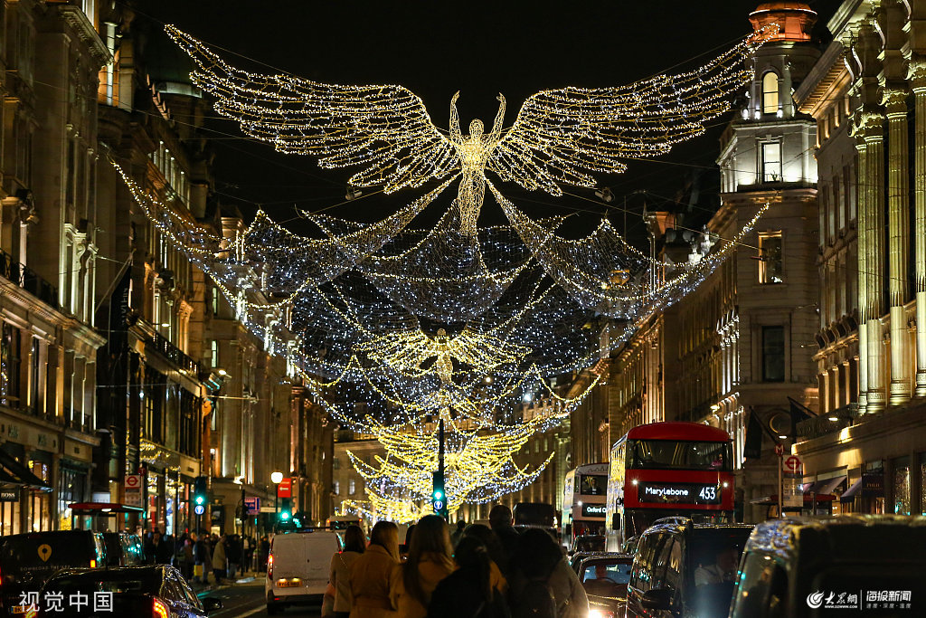 圣誕節臨近 倫敦市中心圣誕彩燈溫暖冬夜。
