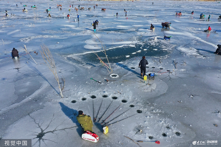 2019年12月7日,北京,大雪節氣,在延慶海坨山下,附近的垂釣愛好者紛紛來到媯河,盡情享受冰釣的樂趣。據垂釣愛好者介紹,這里里凍冰的厚度已經超過了十公分。