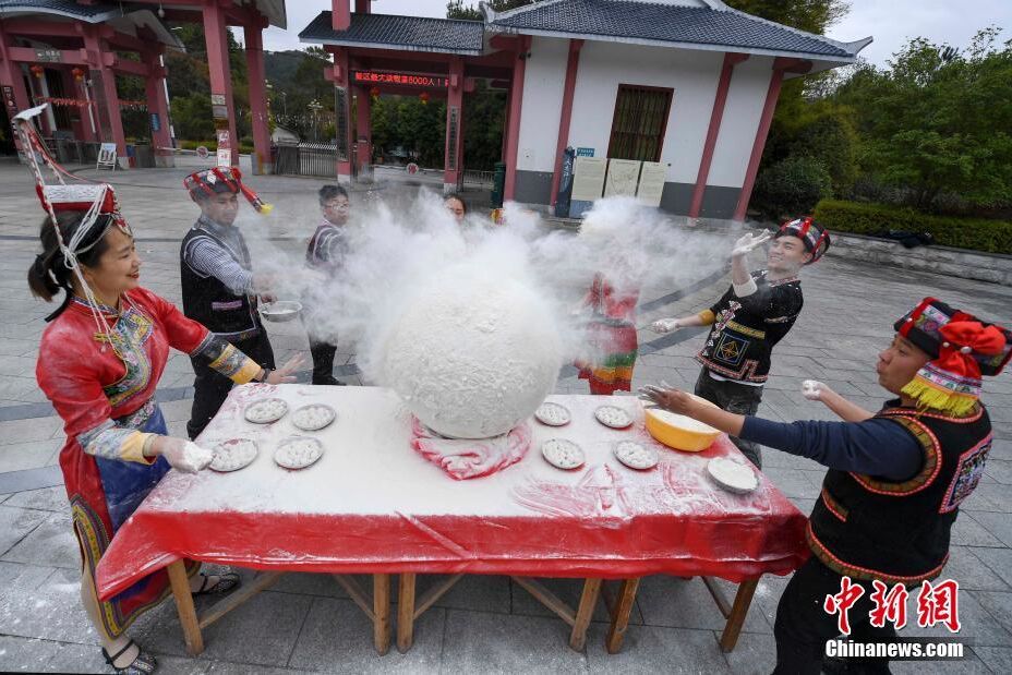 12月20日,畬族民眾正在制作“冬節丸”。當日,湖南汝城九龍江的畬族青年男女們制作了一個直徑1米的“冬節丸”,以此迎接冬至。 中新社記者 楊華峰 攝