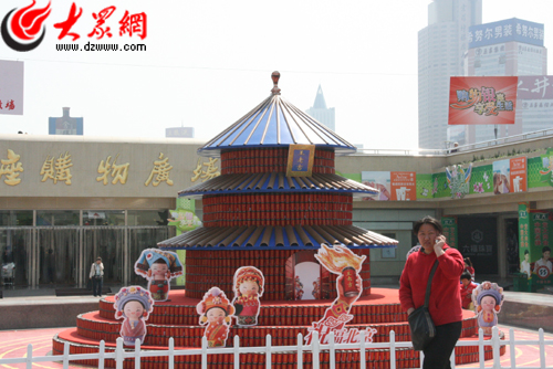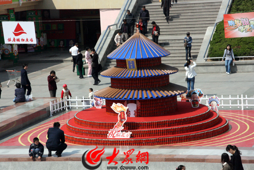 大眾網(wǎng)濟南4月24日訊 北京奧運開幕在即,奧運也成了商家促銷的熱門主題。圖為在濟南某大型超市門口,商家用飲料罐搭成“天壇”模型,祝福北京奧運,吸引了很多市民的目光。(記者 趙永剛 攝影報道)